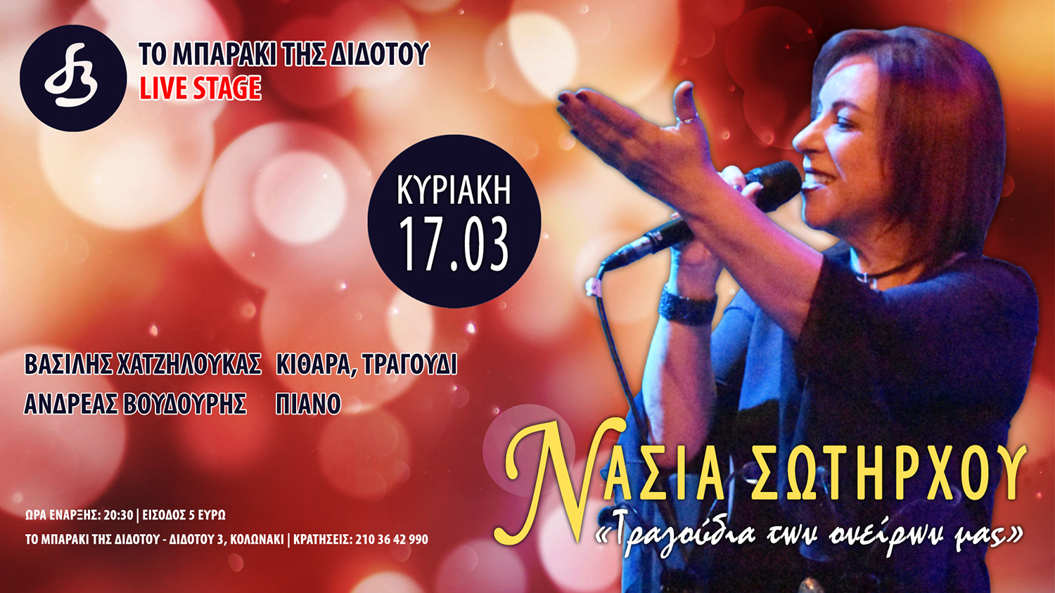 Η Νάσια Σωτήρχου για πρώτη φορά στο «Μπαράκι της Διδότου», σε μια ιδιαίτερη μουσική παράσταση, ερμηνεύει τα «Τραγούδια των ονείρων μας»...