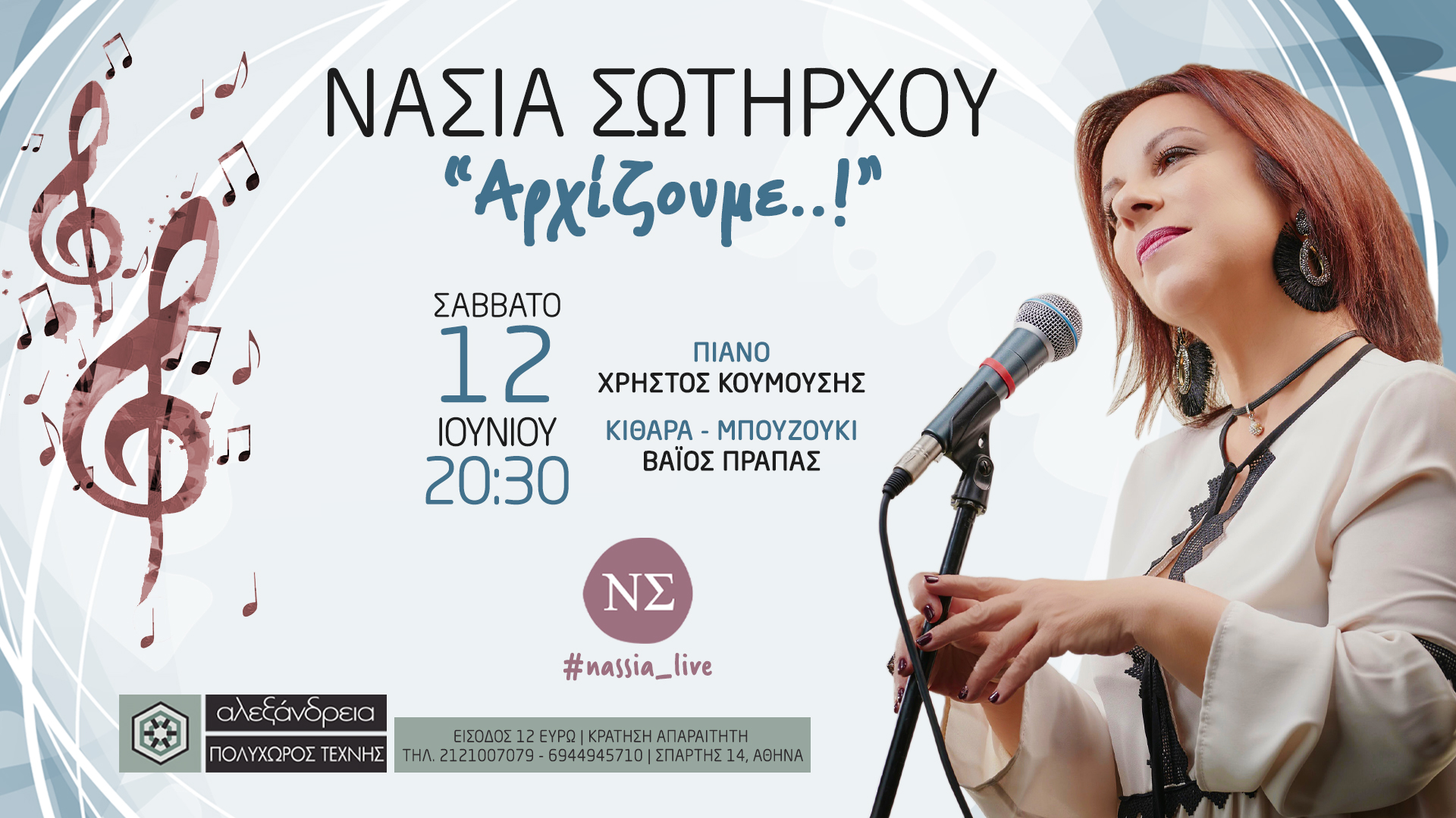 Η Νάσια Σωτήρχου επιστρέφει ανανεωμένη στον ανακαινισμένο, μαγικό και ατμοσφαιρικό κήπο του Πολυχώρου Τέχνης «Αλεξάνδρεια» - Θέατρο Αλεξάνδρεια Βασίλη Βλάχου, το Σάββατο 12 Ιουνίου.