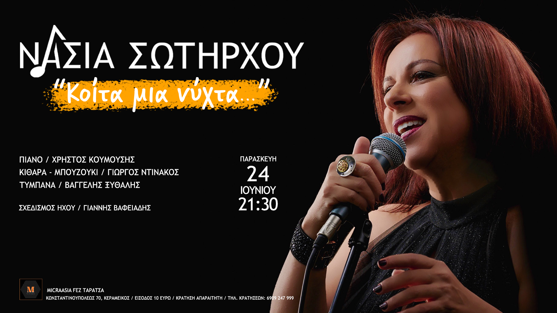 Μια νύχτα γεμάτη από υπέροχες μελωδίες... με κέφι και παλμό, να γίνουμε όλοι μια παρέα, ενώνοντας τις καρδιές μας και τις φωνές μας, όπως μαγικά συμβαίνει κάθε φορά που ανταμώνουμε! Σας περιμένω όλους στην Ταράτσα του Micrasia-Fez, με τεράστια χαρά και προσμονή!!!